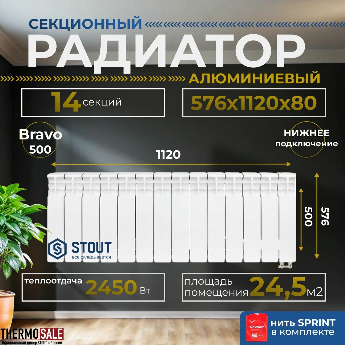Радиатор алюминиевый 500 12 секции нижнее правое подключение STOUT Bravo Нить сантехническая