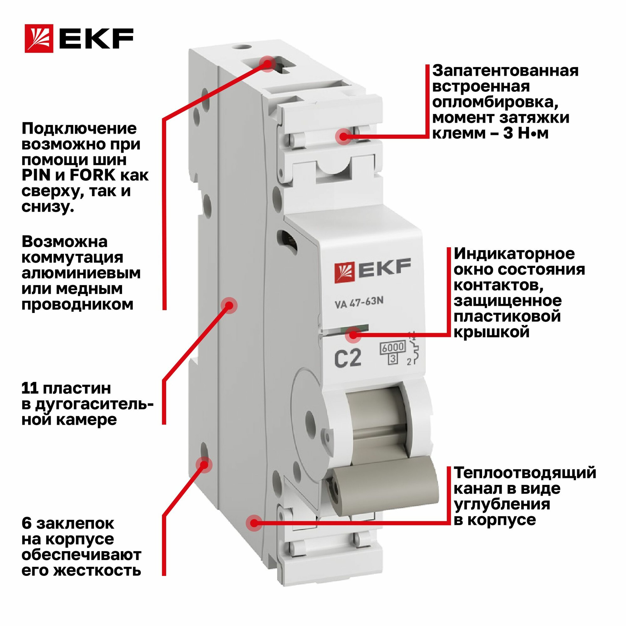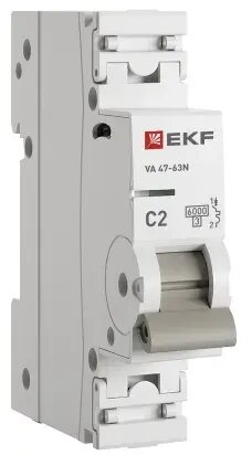 Купить Автомат 2А, тип C, однополюсный 1P, 6кА, cо встроенной опломбировкой клемм EKF PROxima ВА 47-63N (Автоматический выключатель C2)