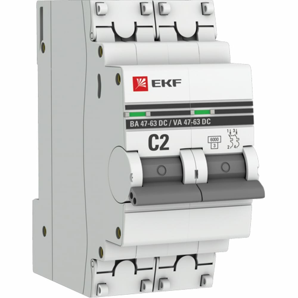 Купить Автомат постоянного тока DC 2А, тип C, двухполюсный 2P, 6кА, cо встроенной опломбировкой клемм EKF ВА 47-63 (Автоматический выключатель C2)