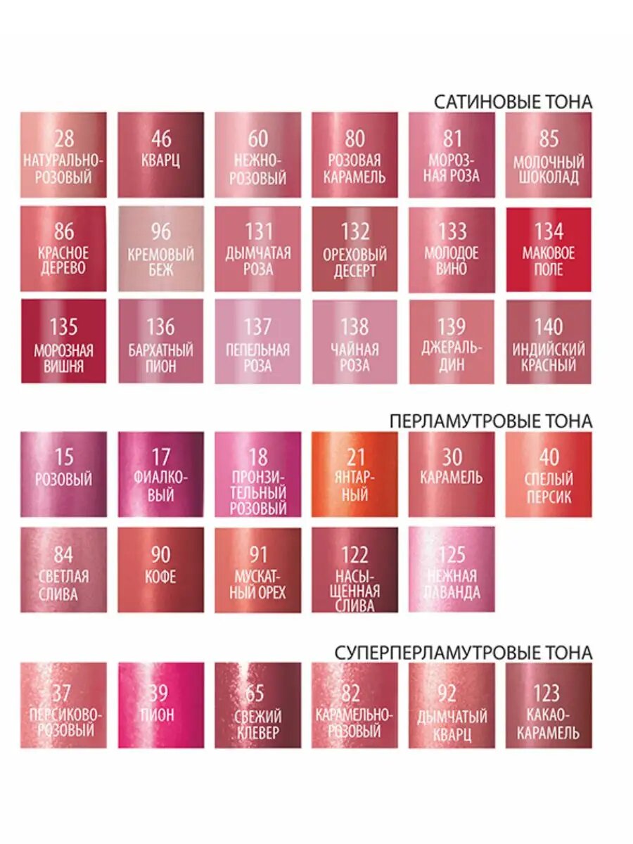| Плюсы: | Помада понравилась, нюдовый сатиновый 139 оттенок, хорошо наносится, практически не скатывается. Оттенок 65 суперперламутровый, на фото сайта другой, чем на самом деле. Так помады понравились. |