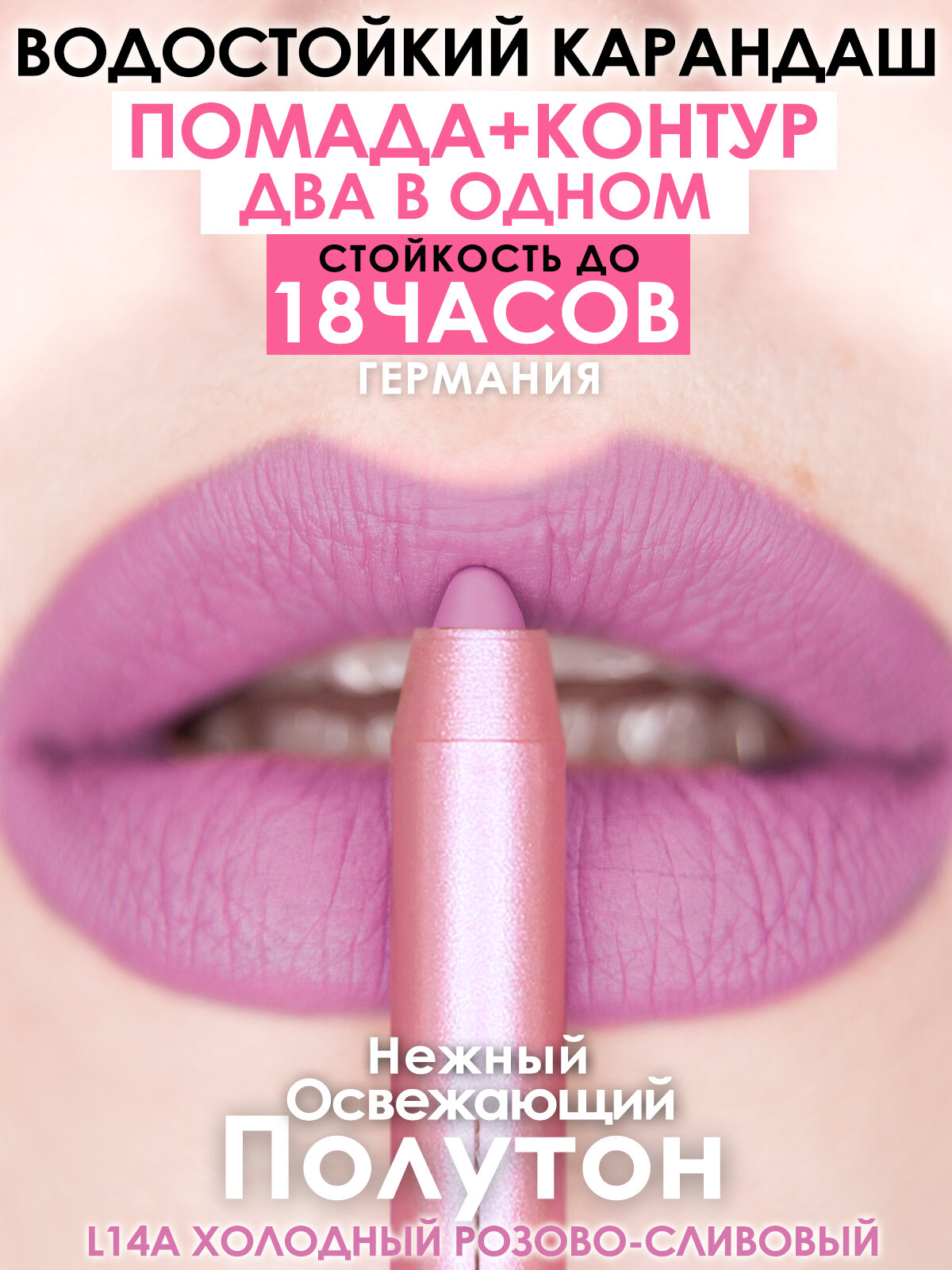 Карандаш-помада "MAKE U MAKE" L08, стойкий, кремовый, лиловый, гипоаллергенный
