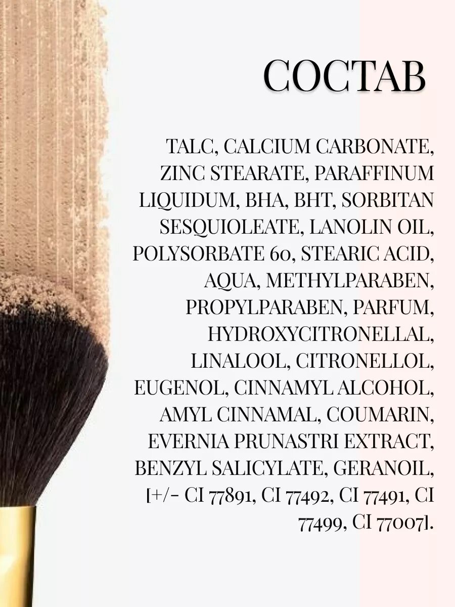 | Отзыв: | У меня она в оттенке 50. Закрепляю ей макияж. Влажным способом наносить ее нереально, а вот как финальный штрих она смотрится прекрасно. Мне нравится то, как она пахнет, хотя многим аромат кажется бабушкиным.. |
