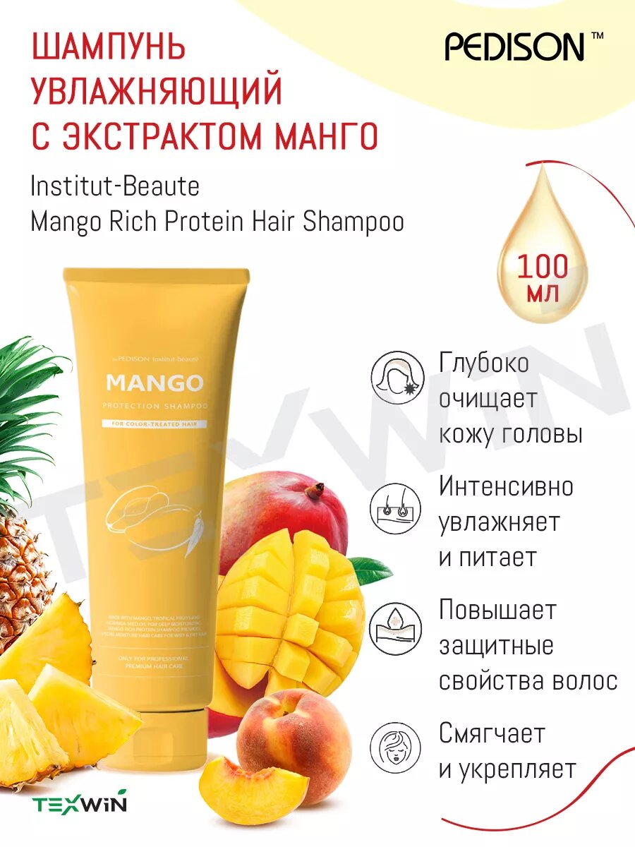 PEDISON Восстанавливающий шампунь для волос с протеинами и маслом Манго Institute-Beaute Mango Rich Protein Hair, питающий, подходит для сухих и жирных волос, Корея- 100 мл