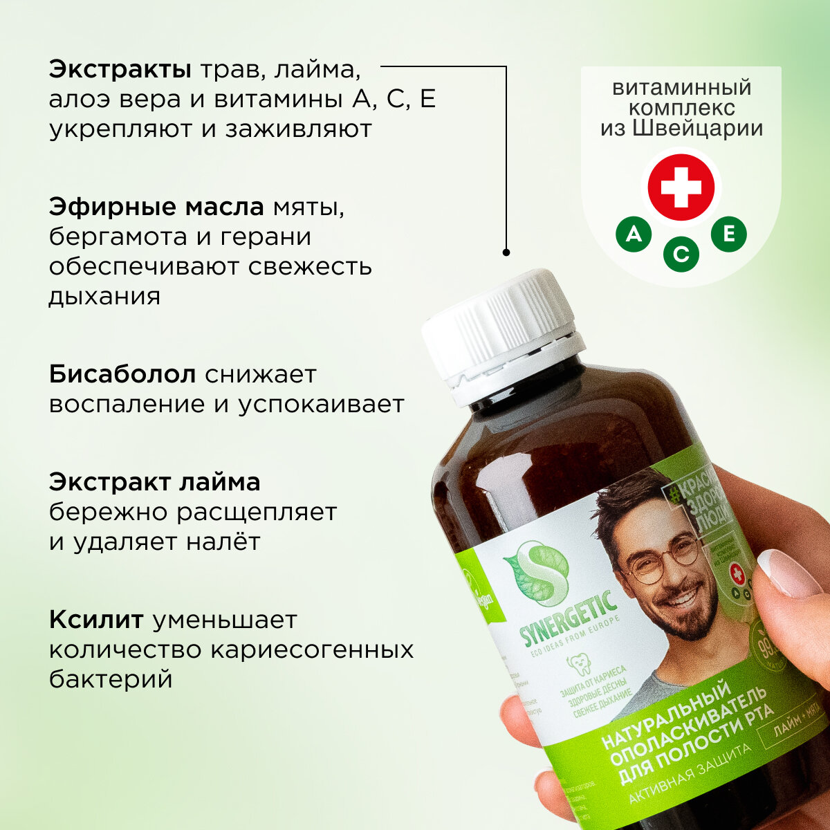 Ополаскиватель для полости рта SYNERGETIC Активная защита лайм+мята, без фтора, защита от кариеса, 200мл 4607971451662