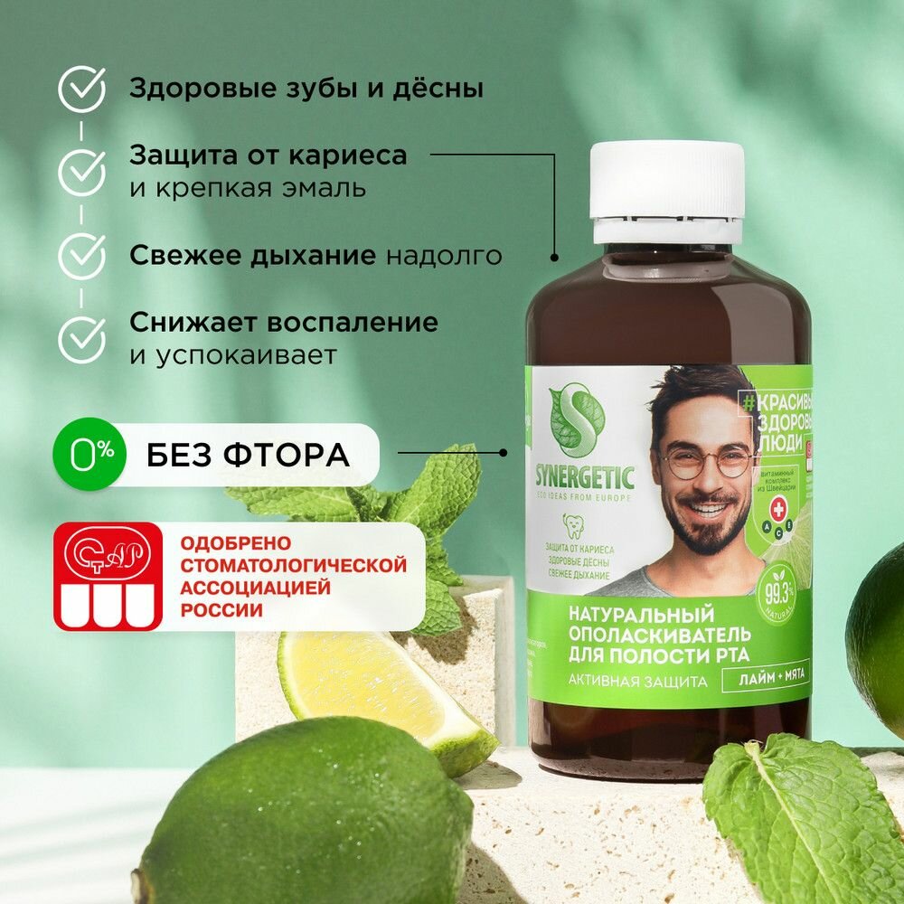 Ополаскиватель для полости рта SYNERGETIC Активная защита лайм+мята, без фтора, защита от кариеса, 200мл 4607971451662