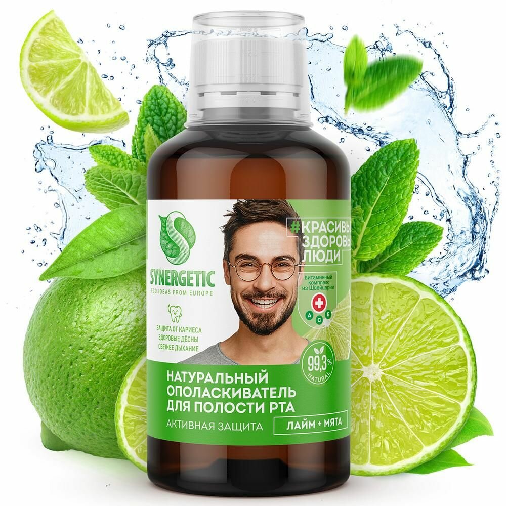 Ополаскиватель для полости рта SYNERGETIC активная защита "лайм + мята" натуральный, без фтора, 200мл