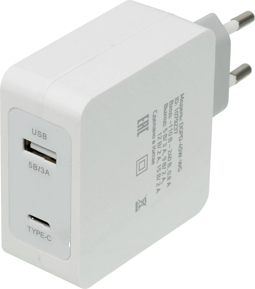 Сетевое зарядное устройство Digma DGPD-45W-WG, USB-C + USB-A, 3A, белый