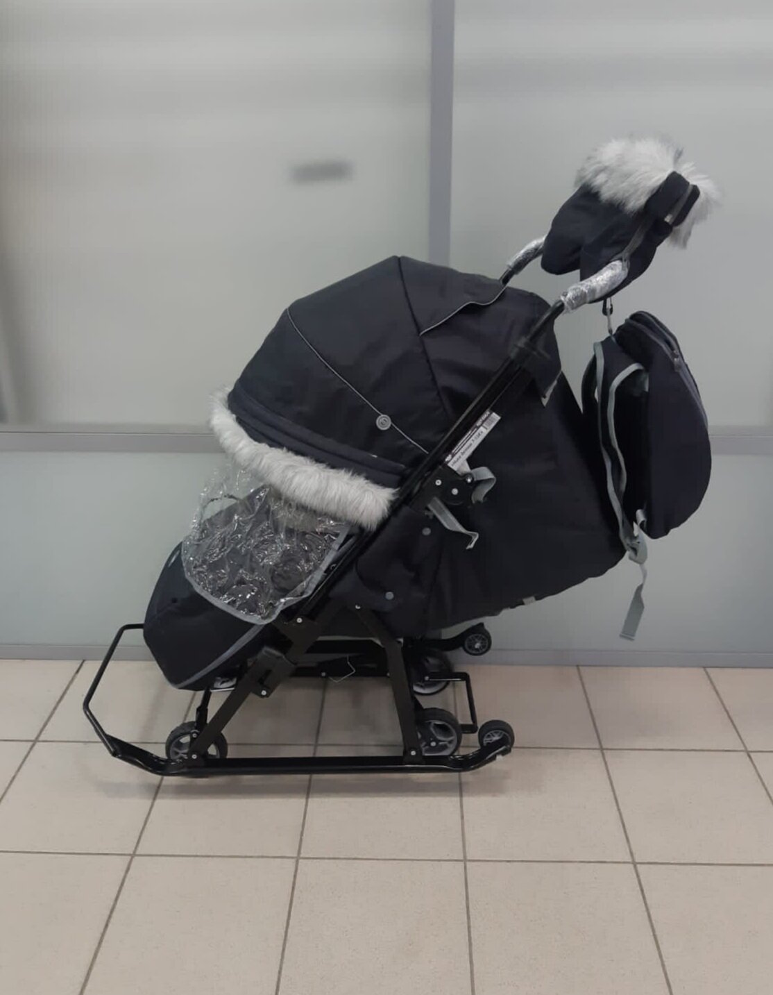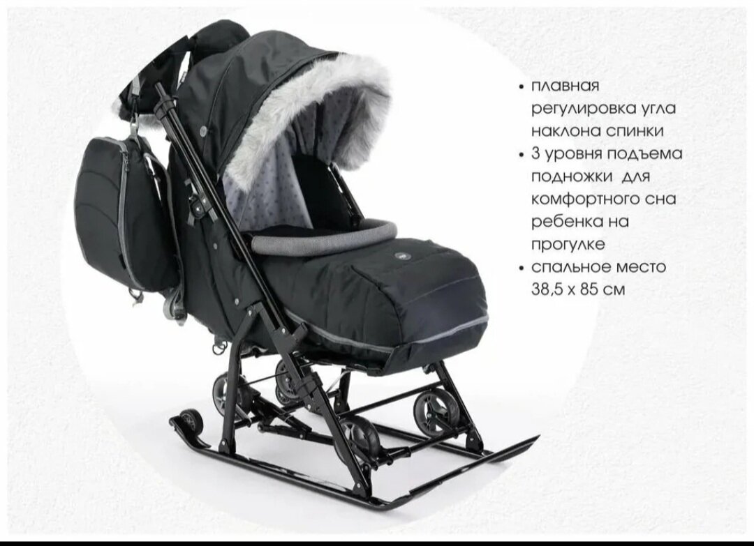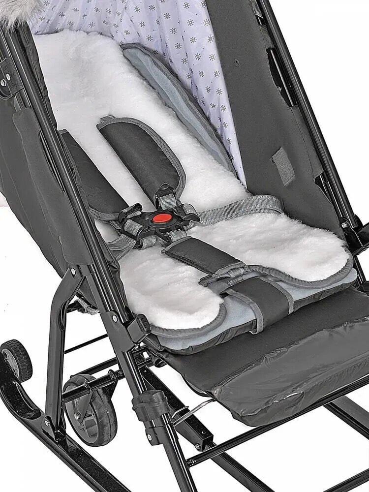 | Плюсы: | Легко идёт по снегу, удобно маневрировать. Колеса переключаются на полозья без усилий, ручка перекидная. Есть меховой матрасик, много места. Малышу в зимнем комбинезоне и укутанному пледом вполне комфортно, причем чехол для ног утеплённый. В капюшоне есть окошко. В комплекте рюкзак и рукавицы.