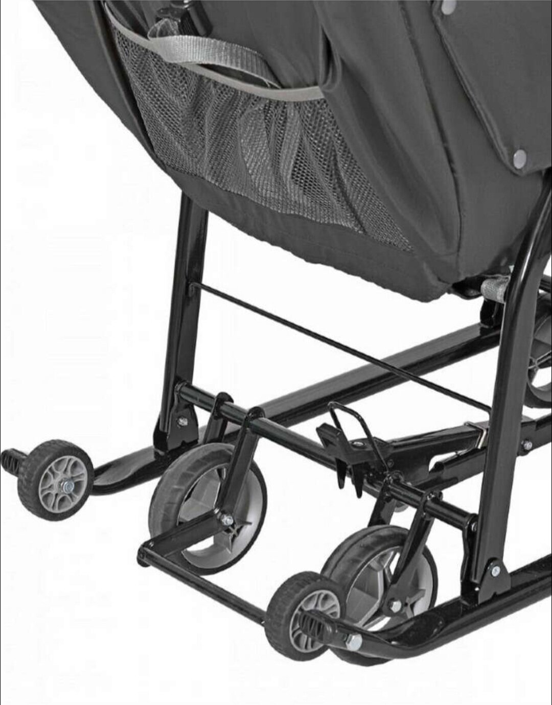 | Минусы: | Неудобно переключать с полозьев на колеса. Для высокого человека будет задевать ногами об санки при погудки |