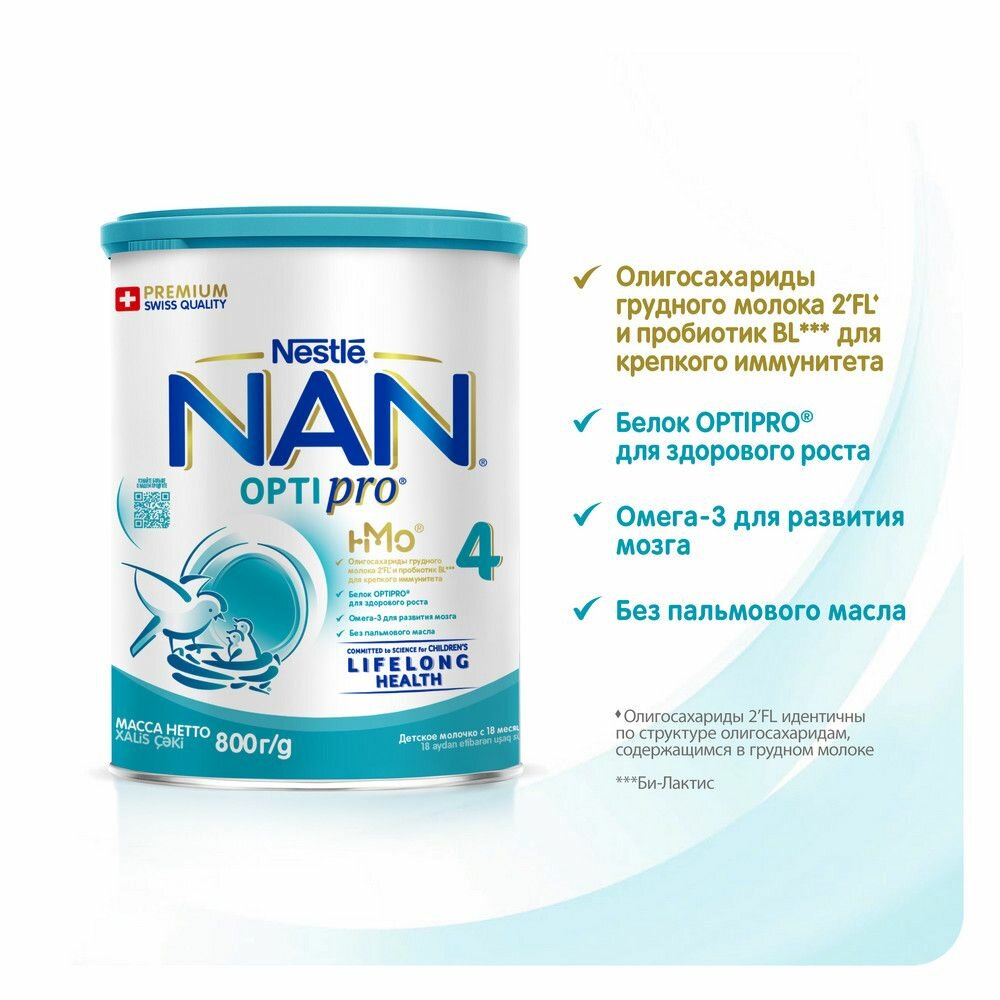 NAN 4 OPTIPRO Детское молочко для детей с 18 месяцев с олигосахаридами 2'FL, 800 г