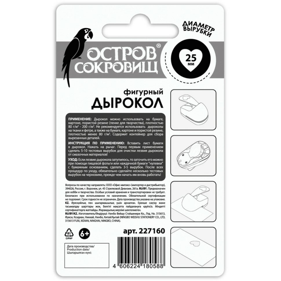 Дырокол фигурный "Сердце", диаметр вырезной фигуры 25 мм, остров сокровищ, 227160 В комплекте: 1шт.