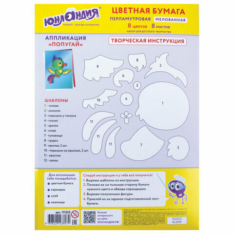 Цветная бумага Юнландия А4, мелованная перламутровая, 8 листов 8 цветов, в папке, 200х290 мм, "Попугай" (111325)