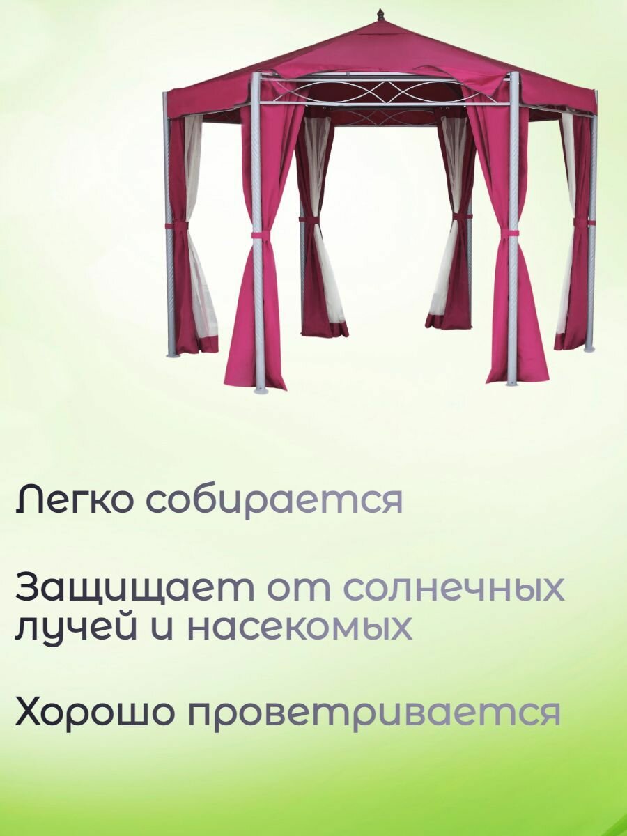 Шатер садовый лето, 3.5x3.5х2.7 м шестиугольный, сталь, цвет фуксия с москитной сеткой. Легко собирается; защищает от солнечных лучей и насекомых