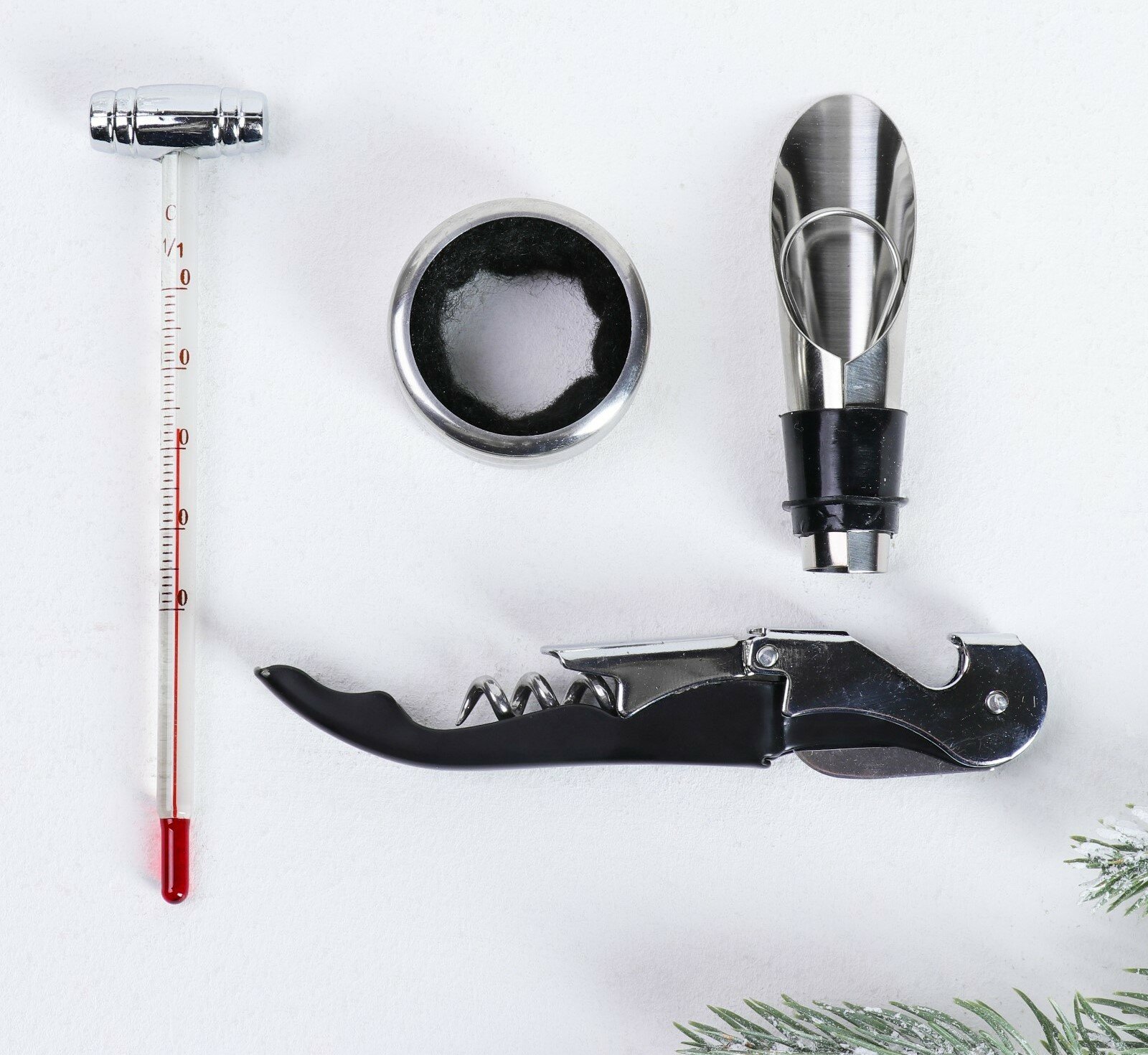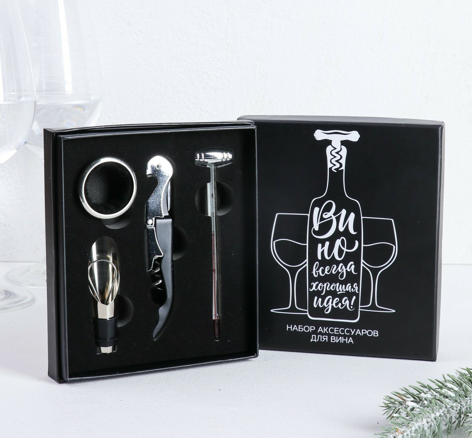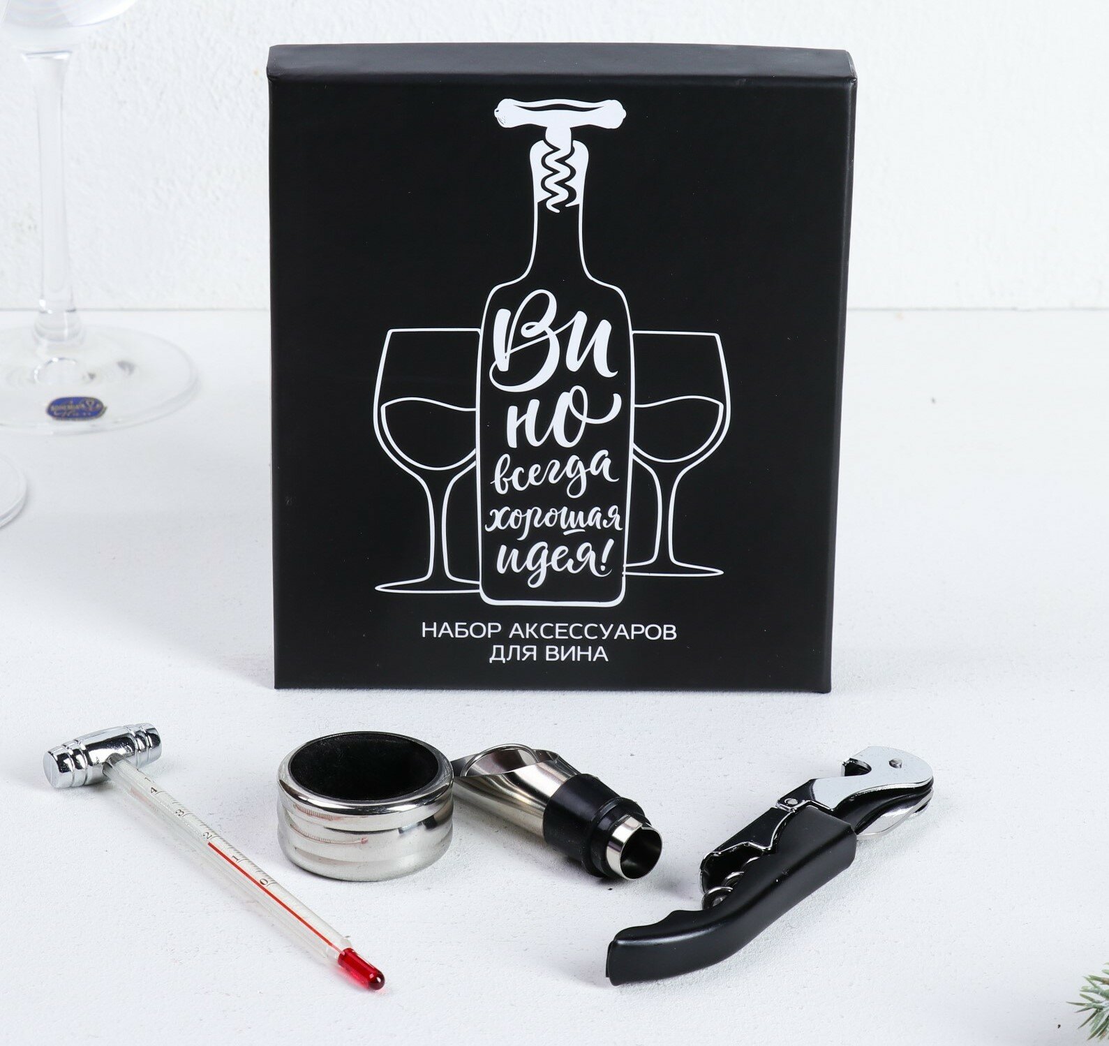 Подарочный набор штопор, аэратор, каплеуловитель, термометр «Вино - всегда хорошая идея»