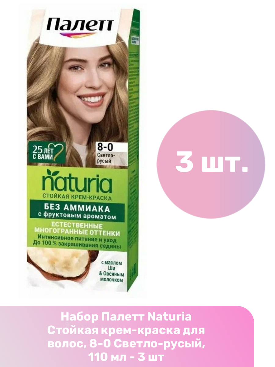 Палетт Naturia Стойкая крем-краска для волос, 8-0 Светло-русый, 110 мл - 3 шт