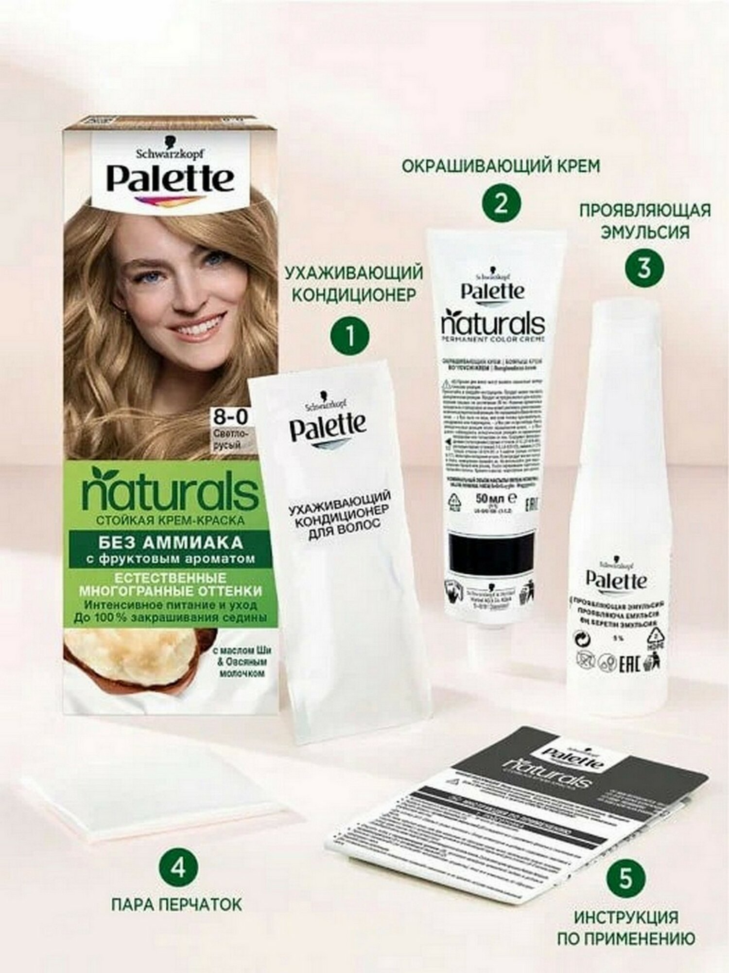 Палетт Naturia Стойкая крем-краска для волос, 8-0 Светло-русый, 110 мл - 6 шт