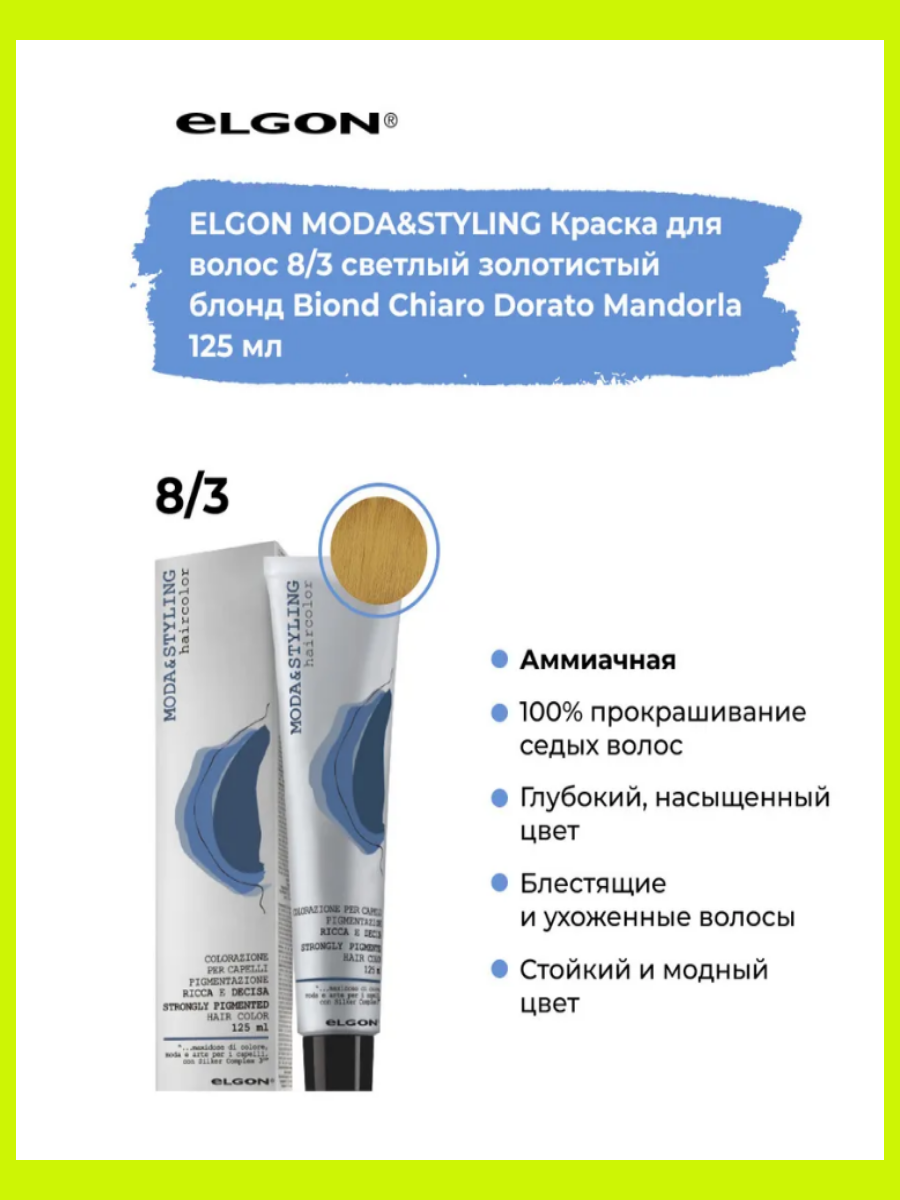 Купить Крем - краска для волос профессиональная Elgon Moda&Styling 8/3 Светлый русый Золотистый 125 мл