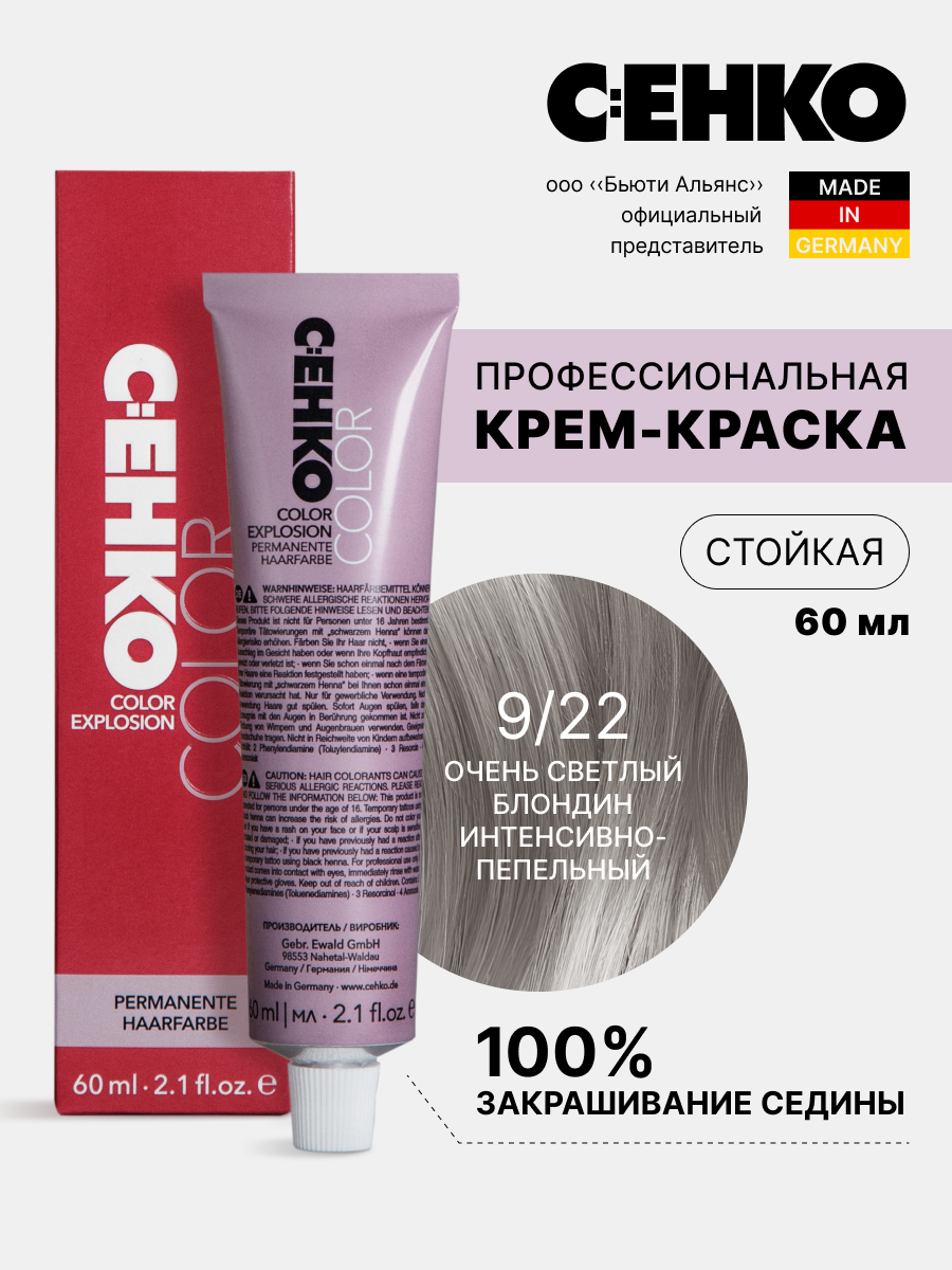 Профессиональная краска для волос 9/2 Яркий пепельный блондин, светлый, холодный, стойкая, для седых волос, 60 мл, C:EHKO COLOR EXPLOSION
