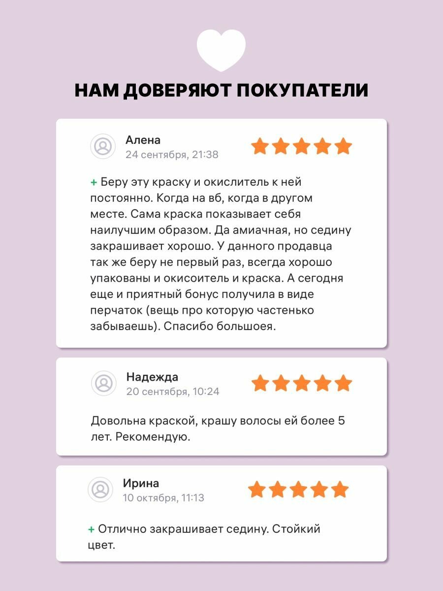 | Плюсы: | Краска нравится, отлично прокрашивает, щадяще действует на волосы |