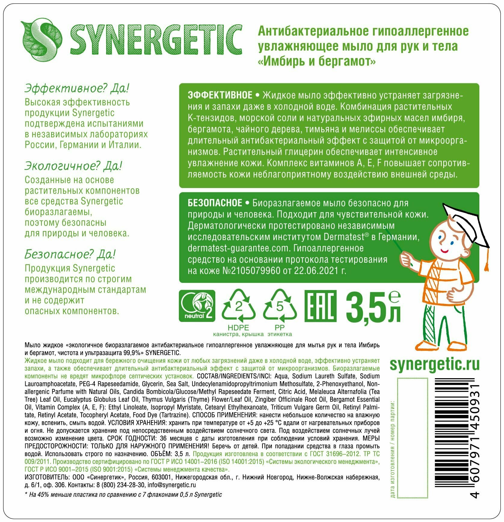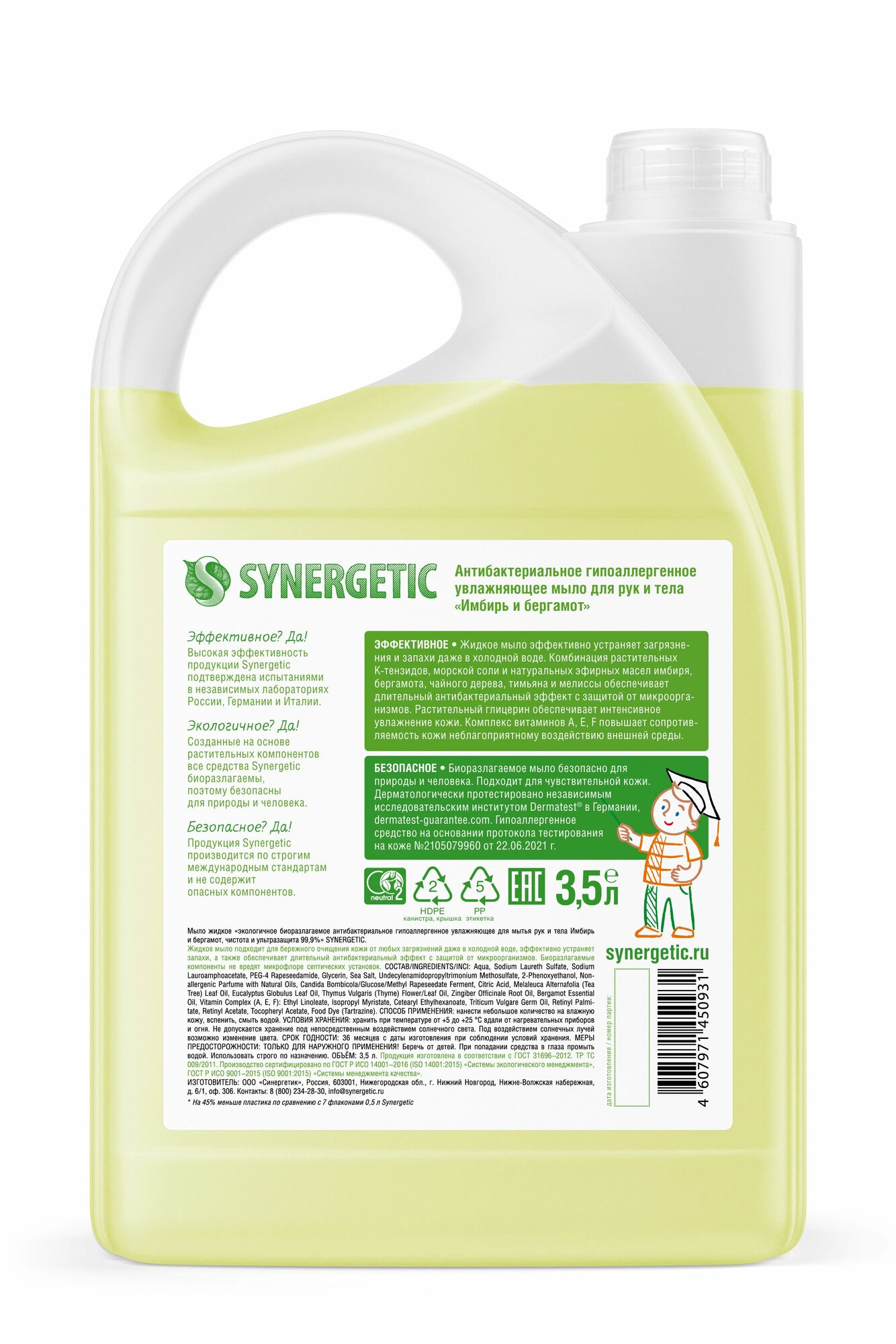 Synergetic Мыло жидкое экологичное Synergetic, антибактериальное, гипоаллергенное, имбирь и бергамот, 3.5 л