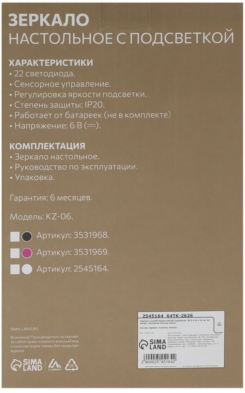Luazon зеркало косметическое настольное KZ-06 зеркало косметическое настольное KZ-06 с подсветкой, белый