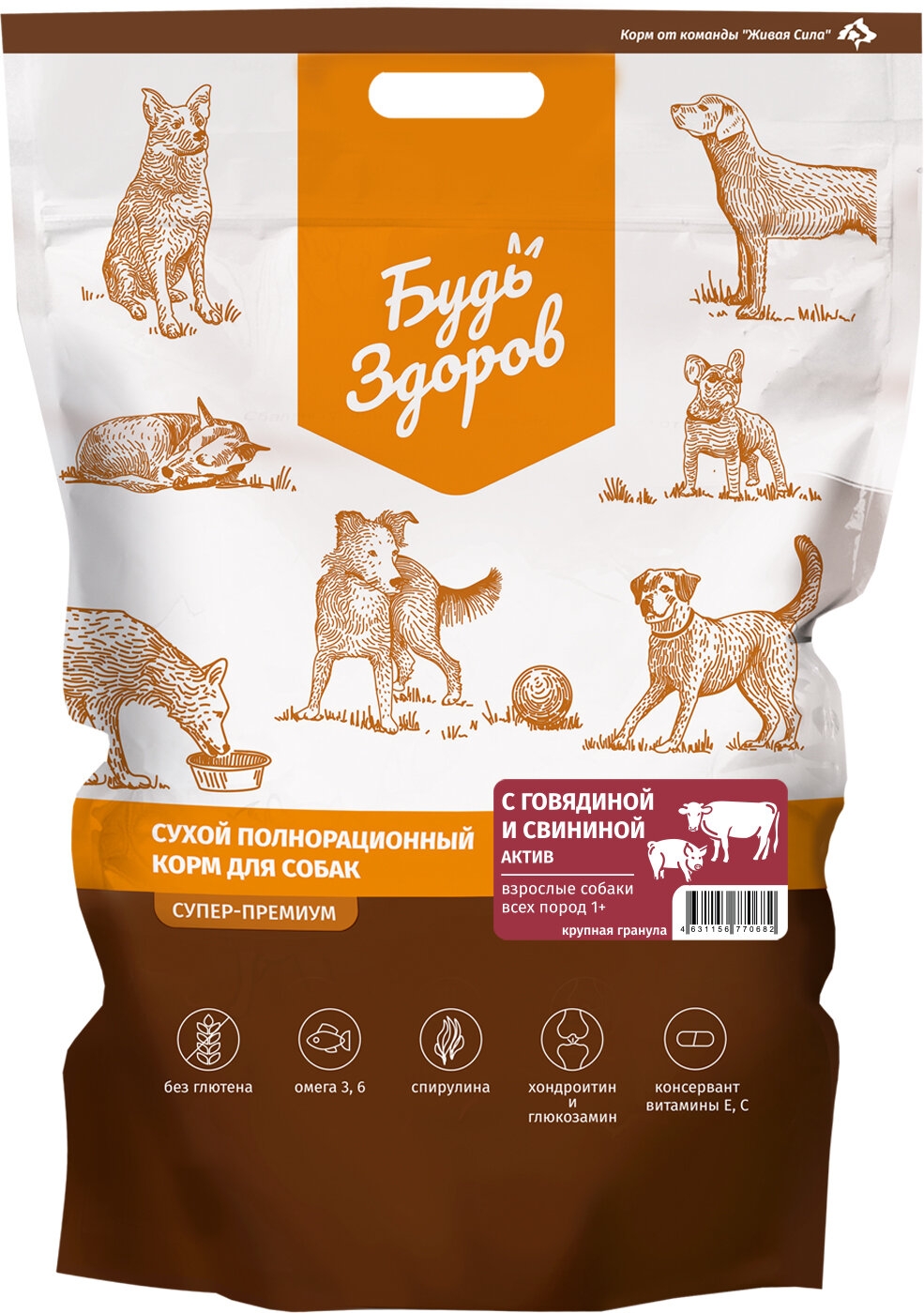 Живая Сила Будь Здоров сухой корм с говядиной и свининой для взрослых активных собак всех пород. Актив. Мелкая гранула 2,5 кг