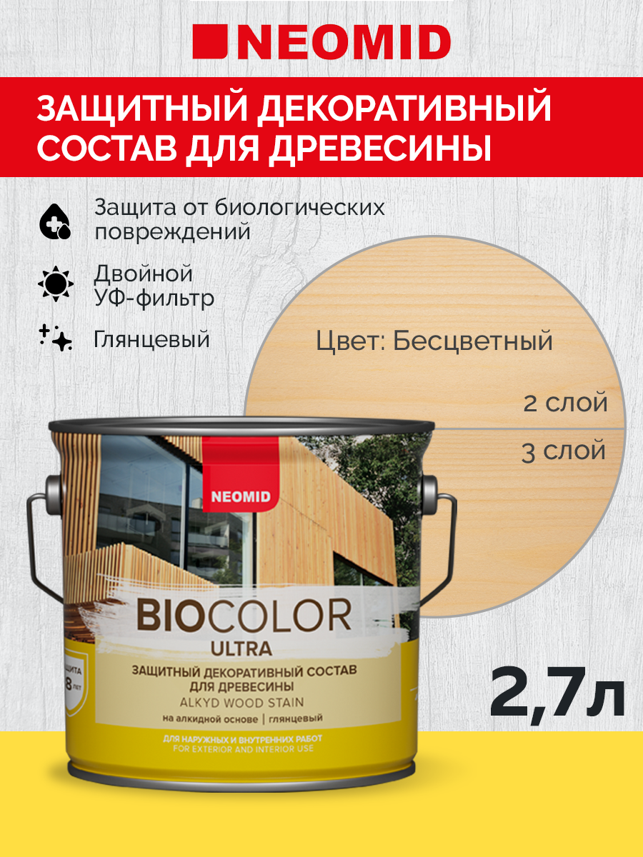 Купить Декоративная Пропитка для Древесины Neomid Biocolor Ultra 2.7л Бесцветный Полуглянцевая с Усиленной Защитой / Неомид Био Колор Ультра.