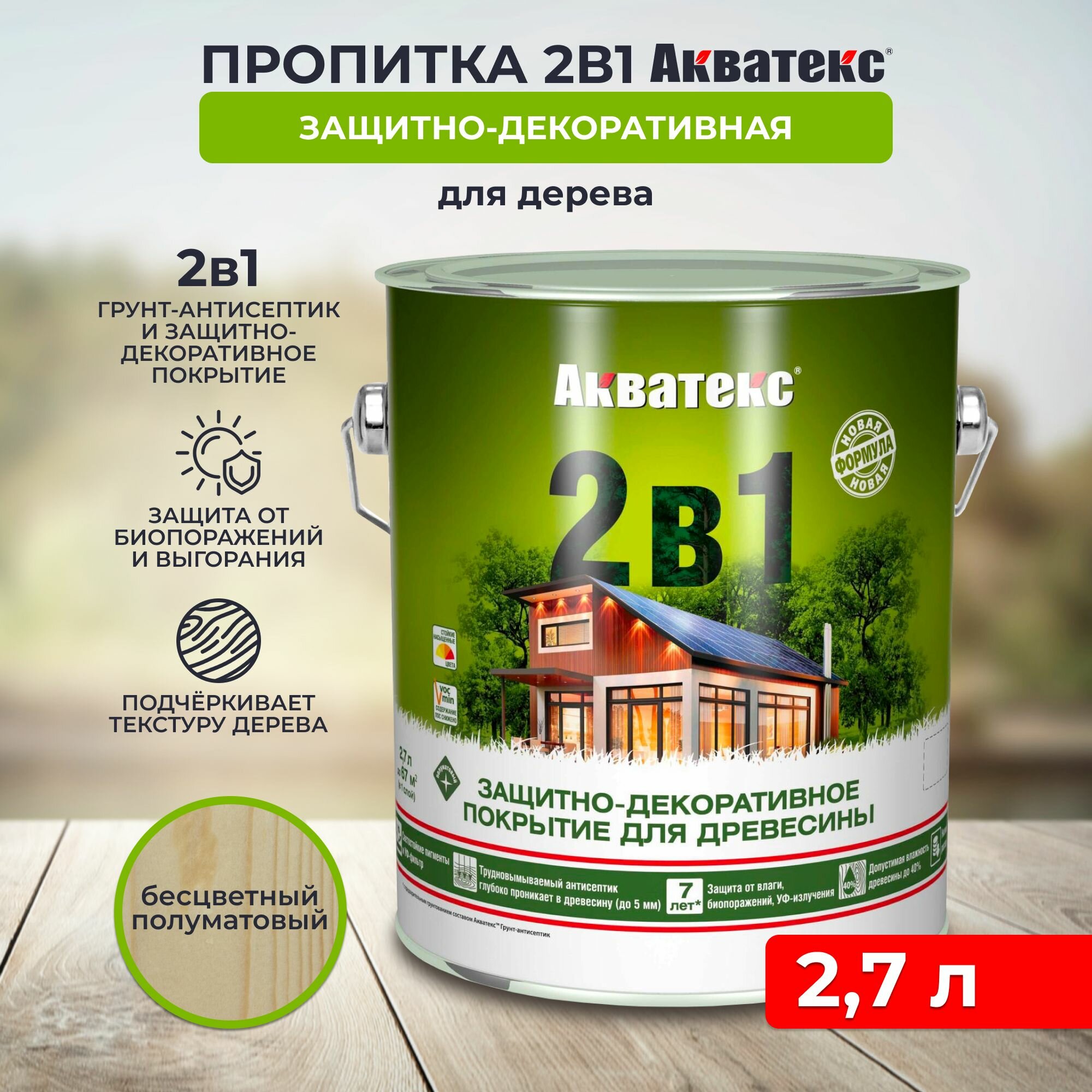 Защитно-декоративное Акватекс покрытие для древесины, пропитка по дереву, 2в1, бесцветный, 2,7 л