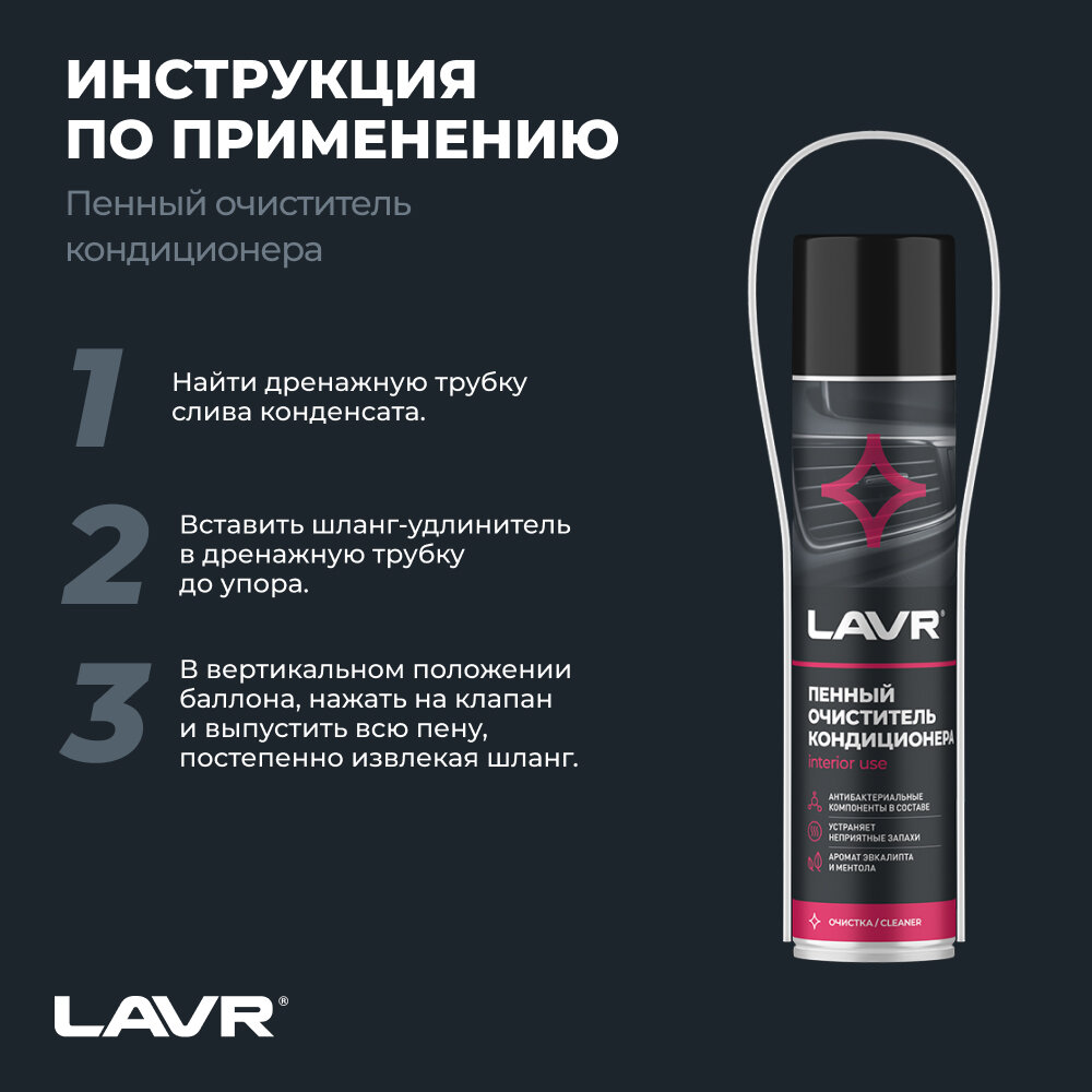 | Способ применения | Определить местонахождение дренажной трубки слива конденсата из кондиционераВставить шланг-удлинитель в дренажную трубку до упораУдерживая баллон в вертикальном положении, нажать на клапан и выпустить всю пену из баллона, постепенно извлекая шлангВынуть шланг-удлинитель из дренажной трубки и подставить под неё емкость для слива загрязнений. После воздействия пены жидкость вытечет из испарителя в емкость.Запустить двигатель и включить режим кондиционирования и рециркуляции, выставив интенсивность обдува в положение "максимум"Дать поработать системе в течение 10 минут при закрытых дверях. Запрещено нахождение людей в салоне!Проверить салон. |