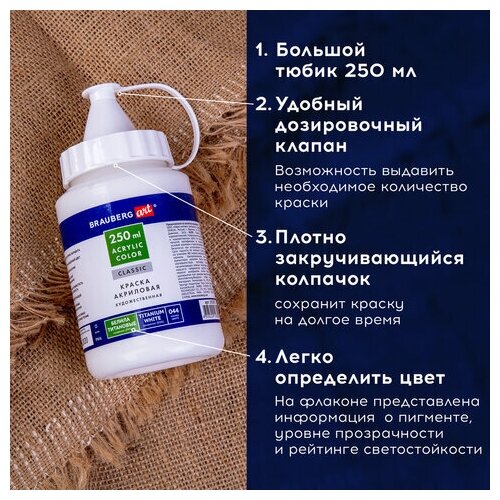 Краска акриловая художественная 250 мл, BRAUBERG ART CLASSIC, "Белила титановые"