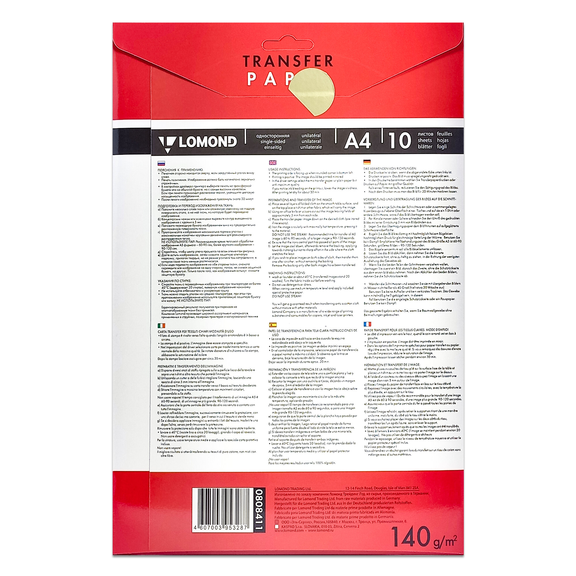 Бумага термотрансферная LOMOND для светлых тканей, А4, 10 шт., 140 г/м2, 0808411