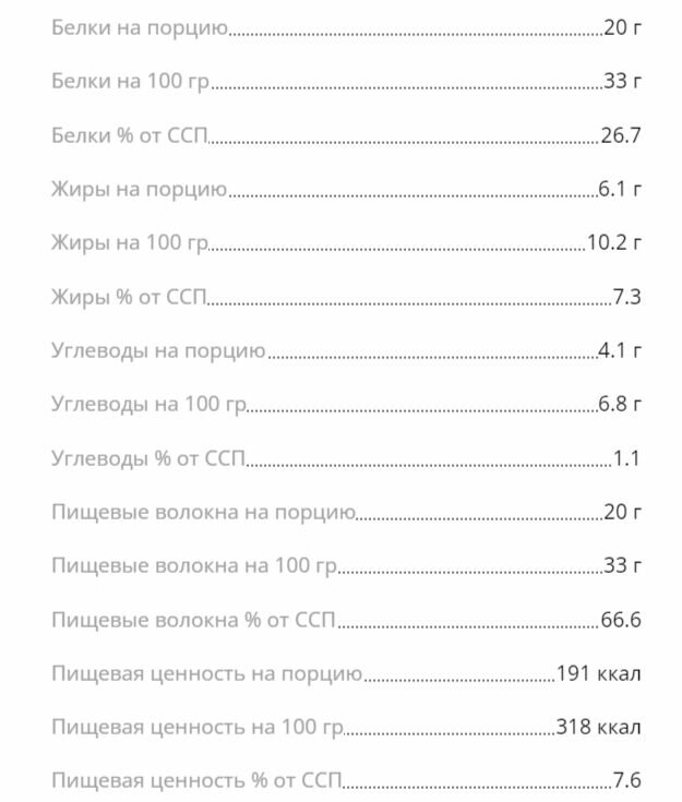 | Энергетическая ценность на 100 г | содержание белков в 100 г: 33 г; содержание жиров в 100 г: 11.6 г; содержание углеводов в 100 г: 6.7 г; калорийность 100 г: 336 ккал |