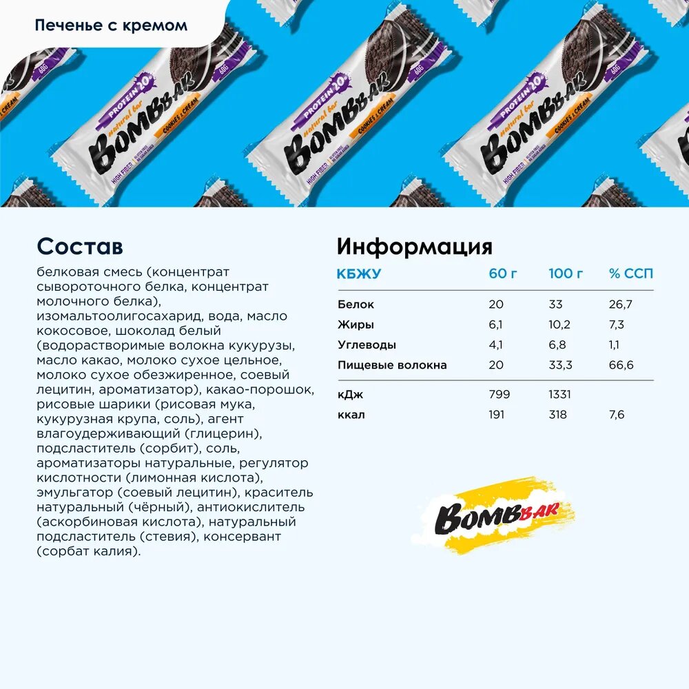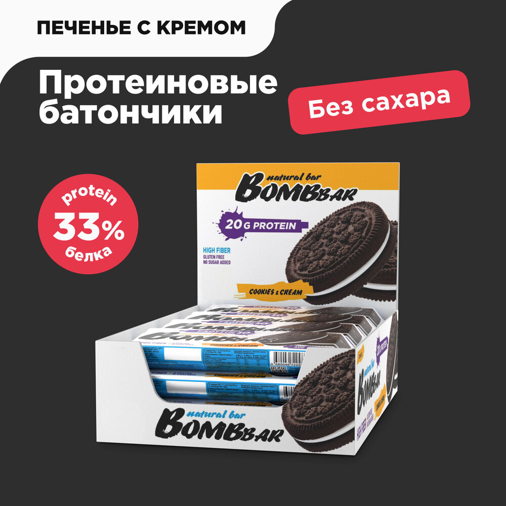 Протеиновый батончик BOMBBAR Protein Bar, Печенье-крем (20шт по 60г)