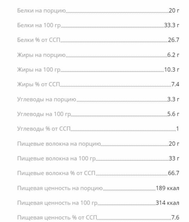 | Энергетическая ценность на 100 г | содержание белков в 100 г: 33 г; содержание жиров в 100 г: 11.6 г; содержание углеводов в 100 г: 6.7 г; калорийность 100 г: 336 ккал |