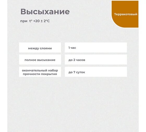 | Дополнительная информация | температура применения от +10°С, относительная влажность воздуха менее 70%; Время высыхания (при t° +20±2°C): межслойная сушка на вертикальных поверхностях – 1 час; межслойная сушка на горизонтальных поверхностях – до 2 часов; окончательный набор прочности покрытия - до 7 суток |