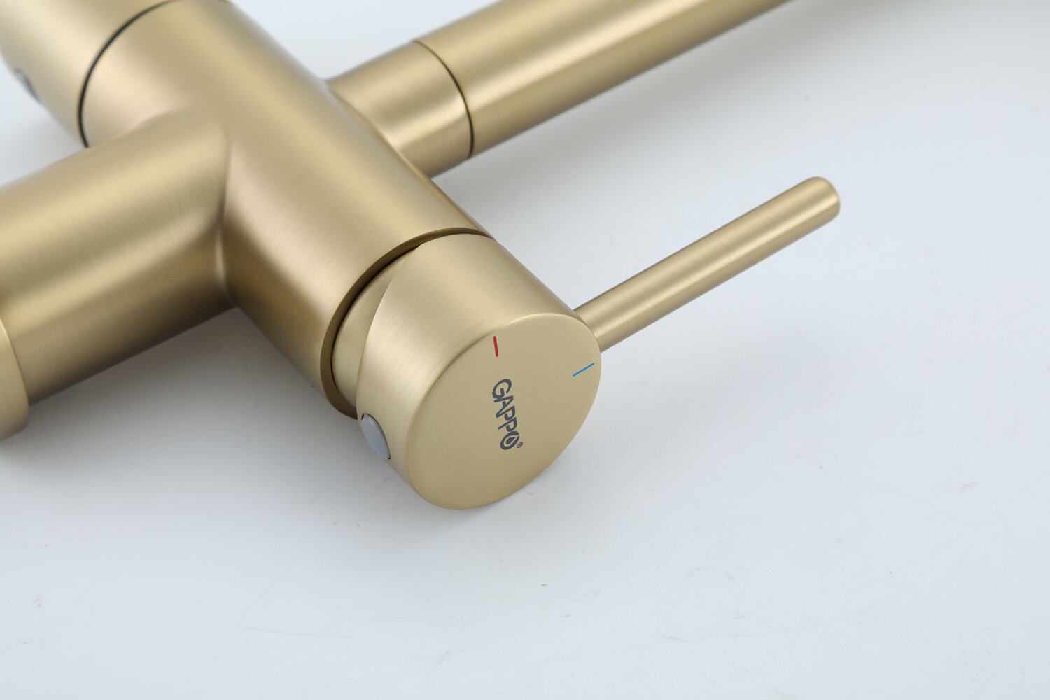 Ниже Вы можете прочитать отзывы на Смеситель для кухни Gappo G4397-83, золотой сатин, покрытие PVD, горизонтальный монтаж, гибкий излив, ознакомится с подробными характеристиками, посмотреть интересные обзоры и фотографии на Смеситель для кухни Gappo G4397-83, золотой сатин, покрытие PVD, горизонтальный монтаж, гибкий излив.