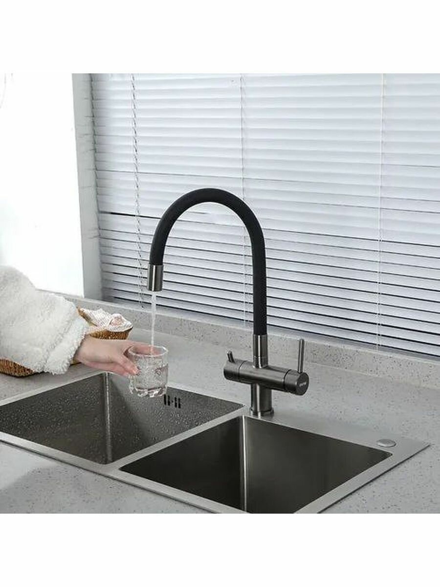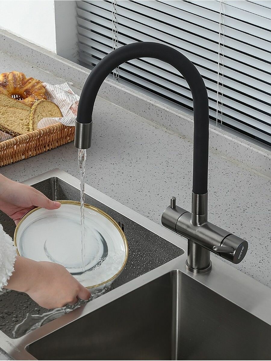 Смеситель для кухонной мойки Gappo G97-89 G4397-89 с подключением фильтра питьевой воды и гибким изливом, оружейная сталь