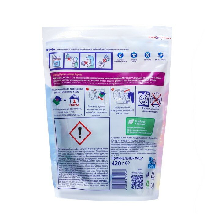 | Способ применения | 1 капсула для 4-5 кг белья и воды любой жесткости. 3 капсулы для сильных загрязнений, жесткой воды, > 7 кг белья. Положите капсулу в барабан стиральной машины, загрузите белье, начните стиркку. |
