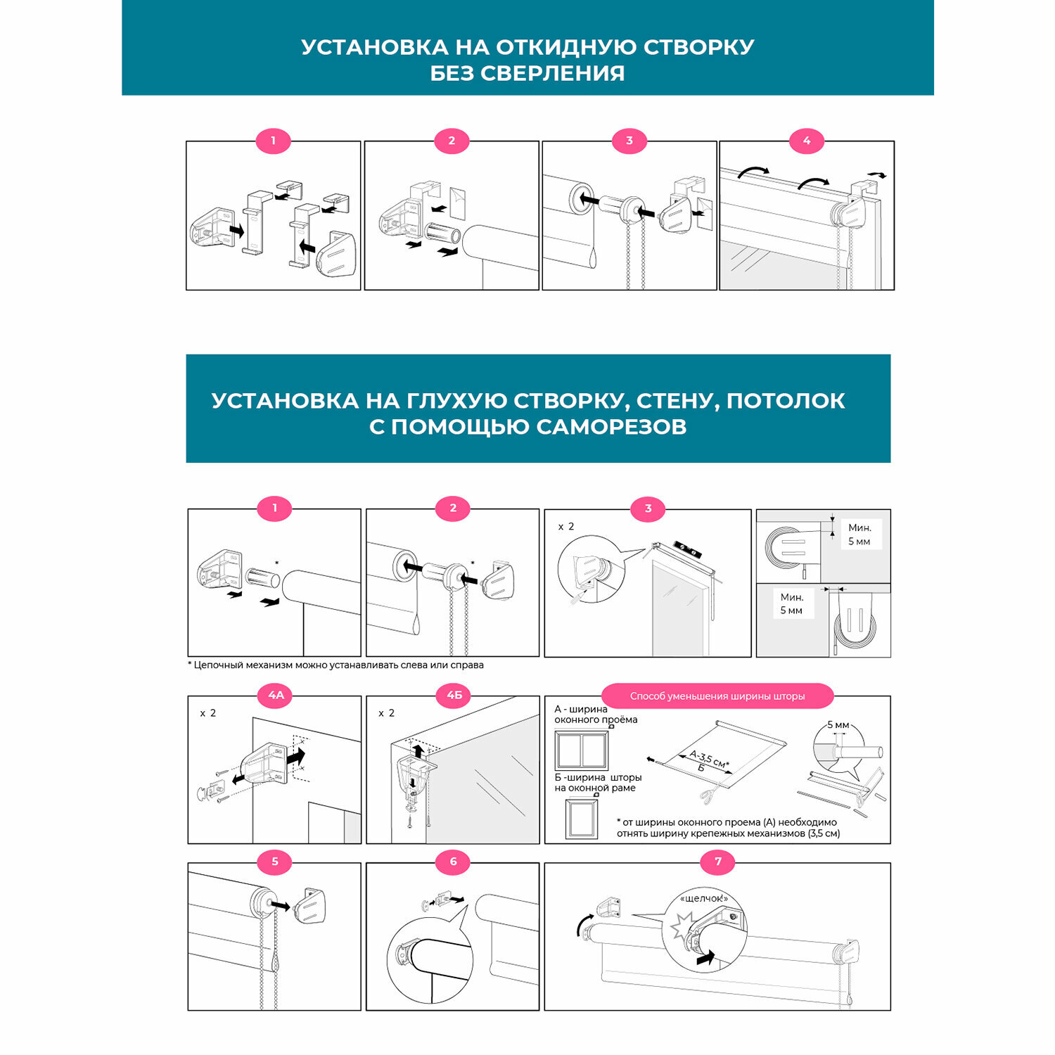 | Комплектация | рулонная штора в сборе, механизм в сборе (D17мм), пластиковая цепочка управления, крепление на откидную створку окна без сверления, инструкция по установке |