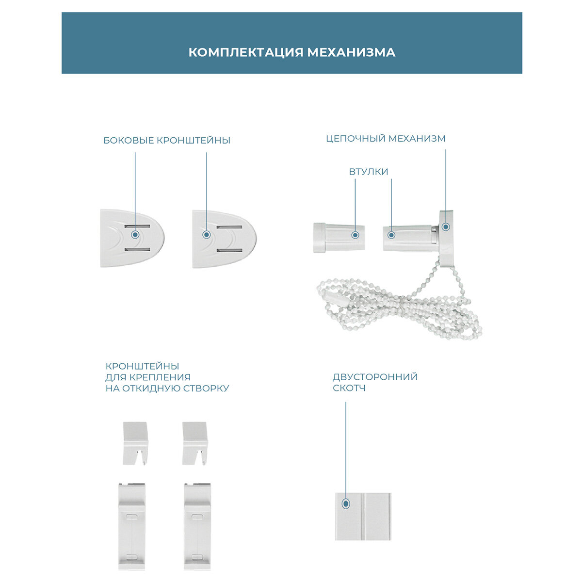 | Комплектация | рулонная штора в сборе, механизм в сборе (D17мм), пластиковая цепочка управления, крепление на откидную створку окна без сверления, инструкция по установке |