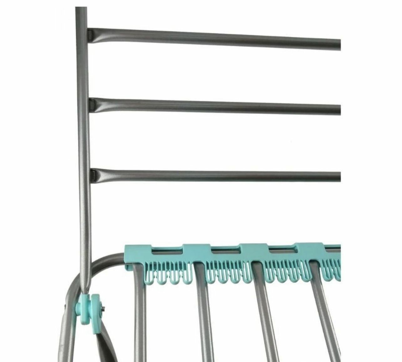 С одной стороны у ножек даже есть колёсики. Удобные крюки для сушки обуви и маленькие крючки для нижнего белья. Классная съемная секция которую можно переместить на батарею если сушилка не помещается в длину или нужно просто быстрее высушить на горячей батарее какие-то вещи. |