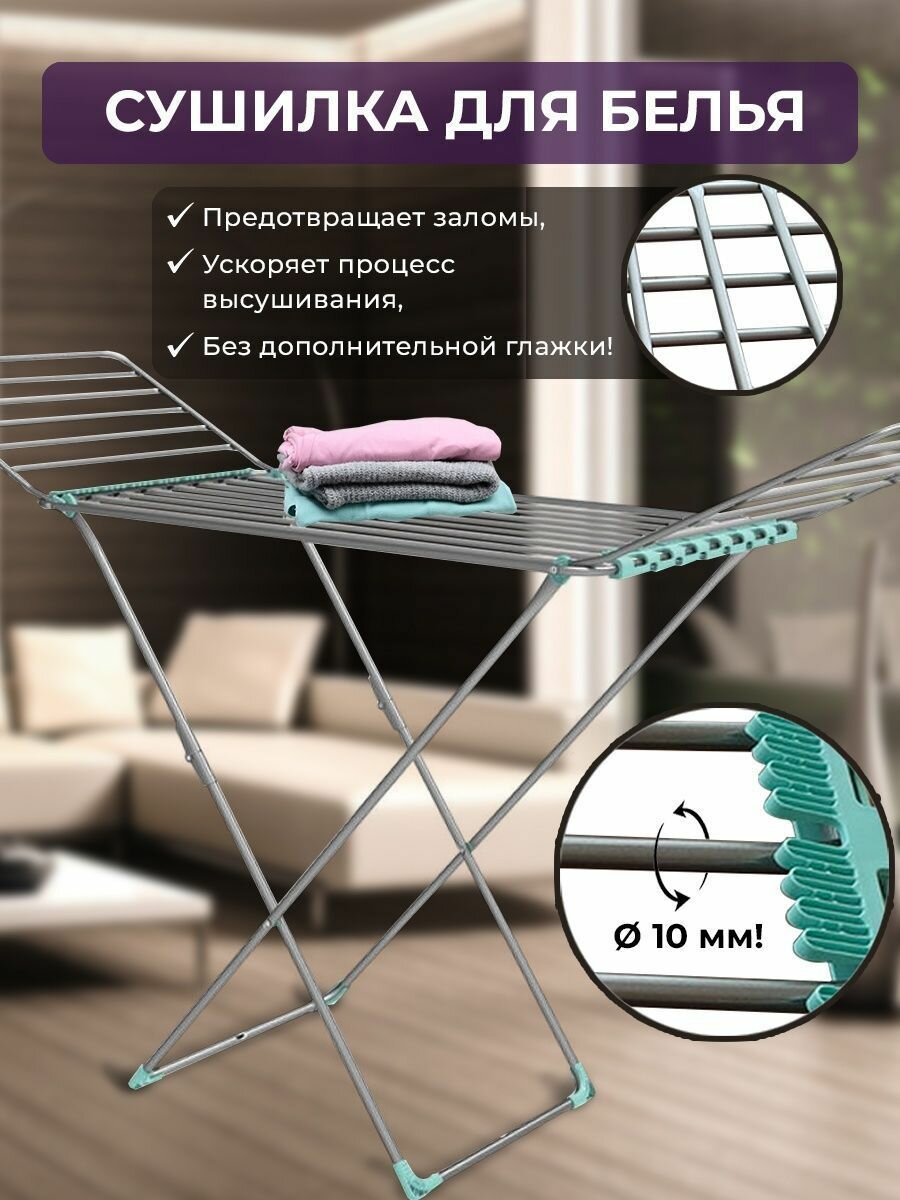 Сушилка для белья напольная складная, серебряный, 3 зоны, до 15 кг. Пластмассовые наконечники на струнах обеспечивают дополнительную устойчивость и предотвращают скольжение белья