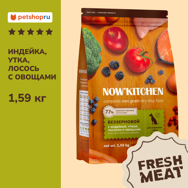 Корм сухой NOW FRESH , беззерновой, для взрослых собак с Индейкой, Уткой и овощами, 1,59 кг