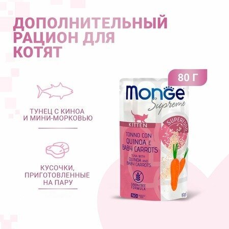 Купить Влажный корм Monge Supreme kitten 1920 г (24 упаковки по 80 грамм) для котят из тунца с киноа и мини-морковью, паучи. Монж Суприм Киттен