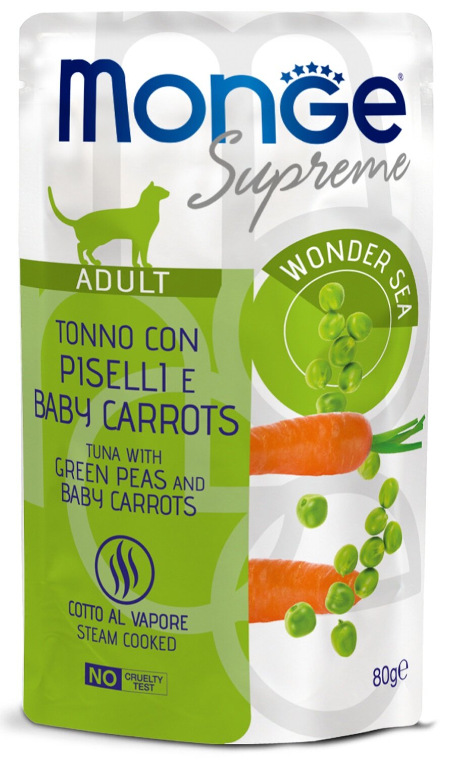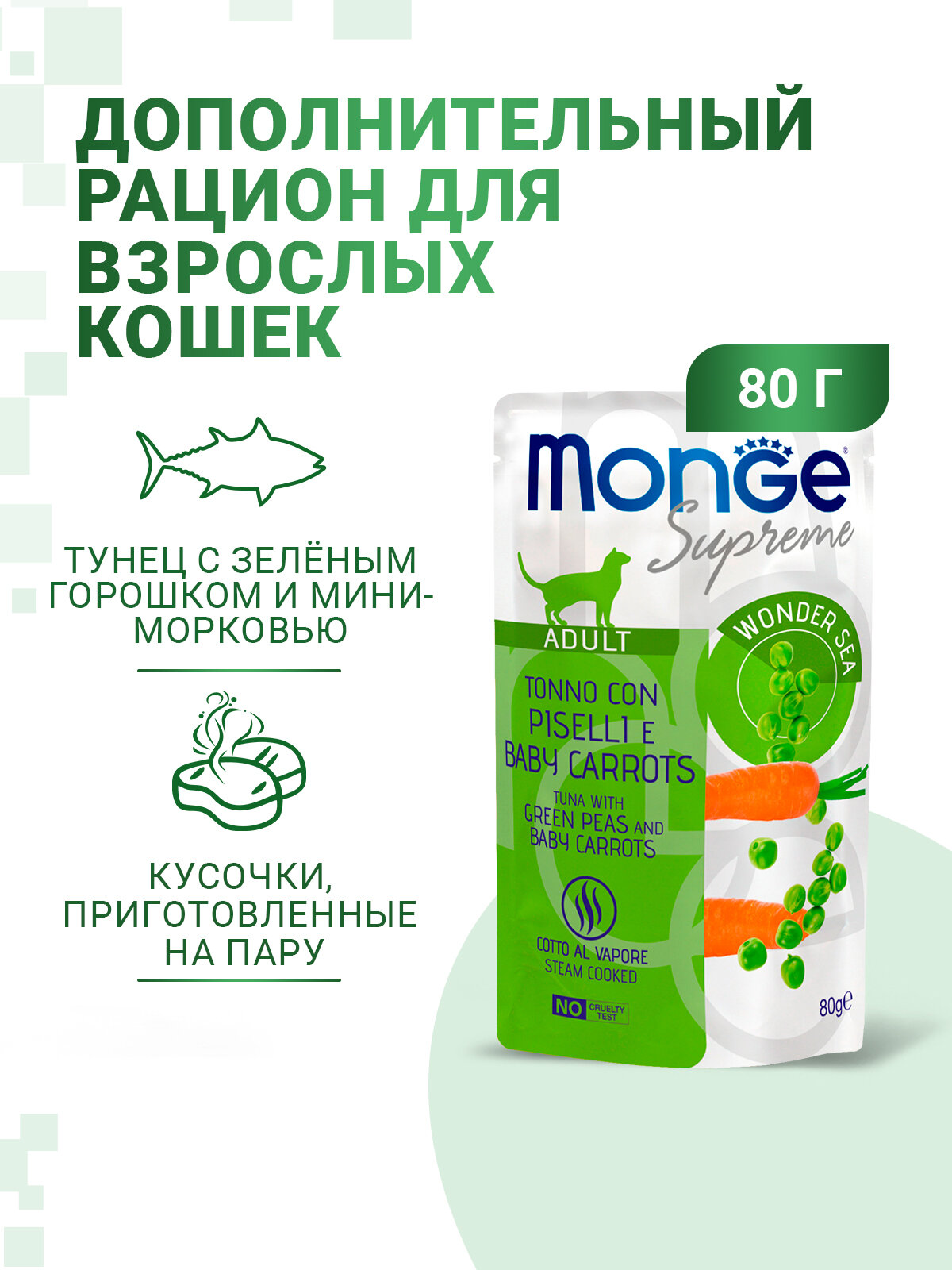Купить Monge Supreme Adult Cat влажный корм для взрослых кошек с тунцом, зелёным горошком и мини-морковью, в паучах - 80 г х 24 шт