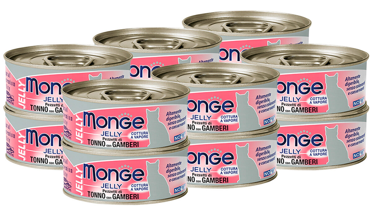 Купить MONGE JELLY CAT для взрослых кошек с желтоперым тунцом и креветками банка 80 гр 80 гр х 12 шт