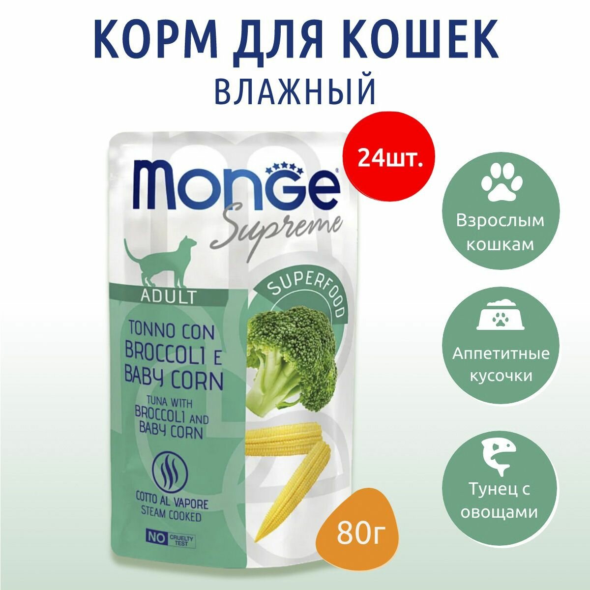 Купить Monge Влажный корм Supreme Adult cat для взрослых кошек с брокколи и мини-кукурузой, паучи 80г*24шт