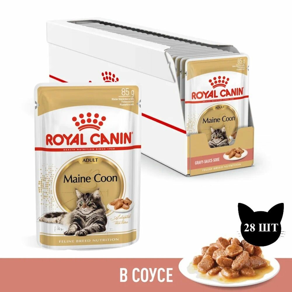 Купить Royal Canin Maine Coon Adult пауч для кошек породы мейн кун (кусочки в соусе) Мясо, 85 г. упаковка 28 шт
