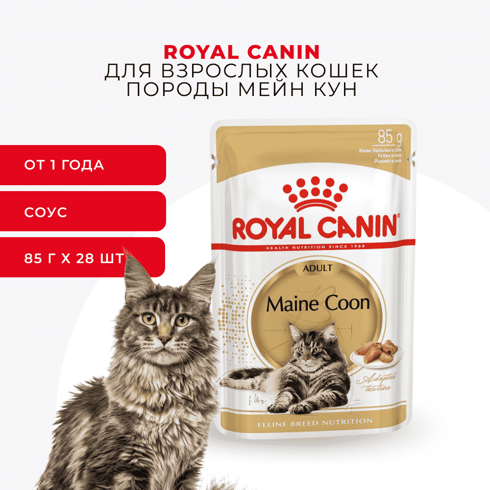 СохранитьRoyal Canin Maine Coon Adult пауч для кошек породы мейн кун (кусочки в соусе) Мясо, 85 г. упаковка 28 шт интересное: