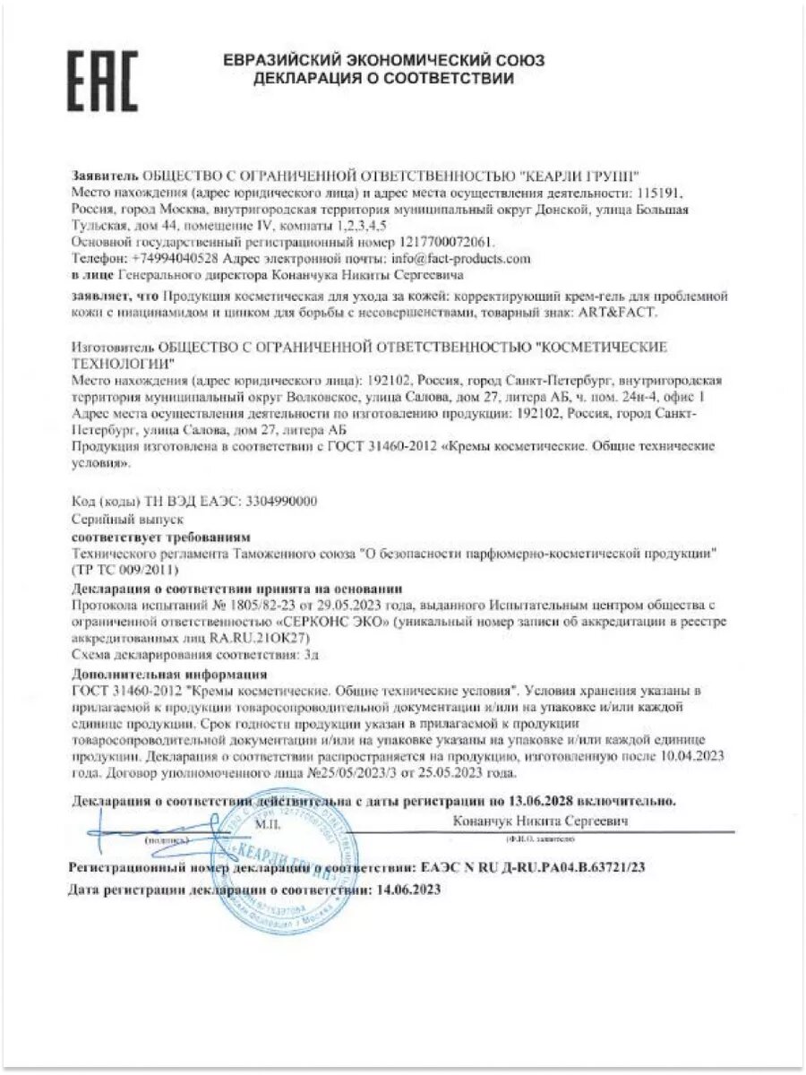 ART&FACT. / Корректирующий крем-гель антиакне для проблемной кожи с ниацинамидом и цинком для борьбы с несовершенствами и постакне., 30 мл